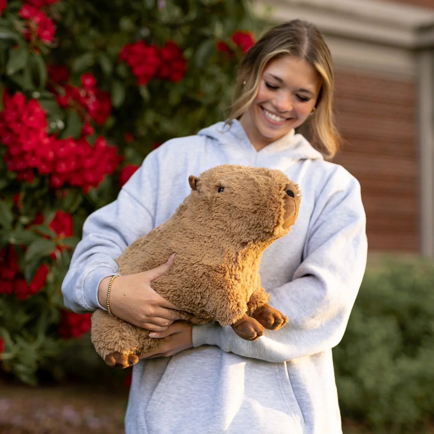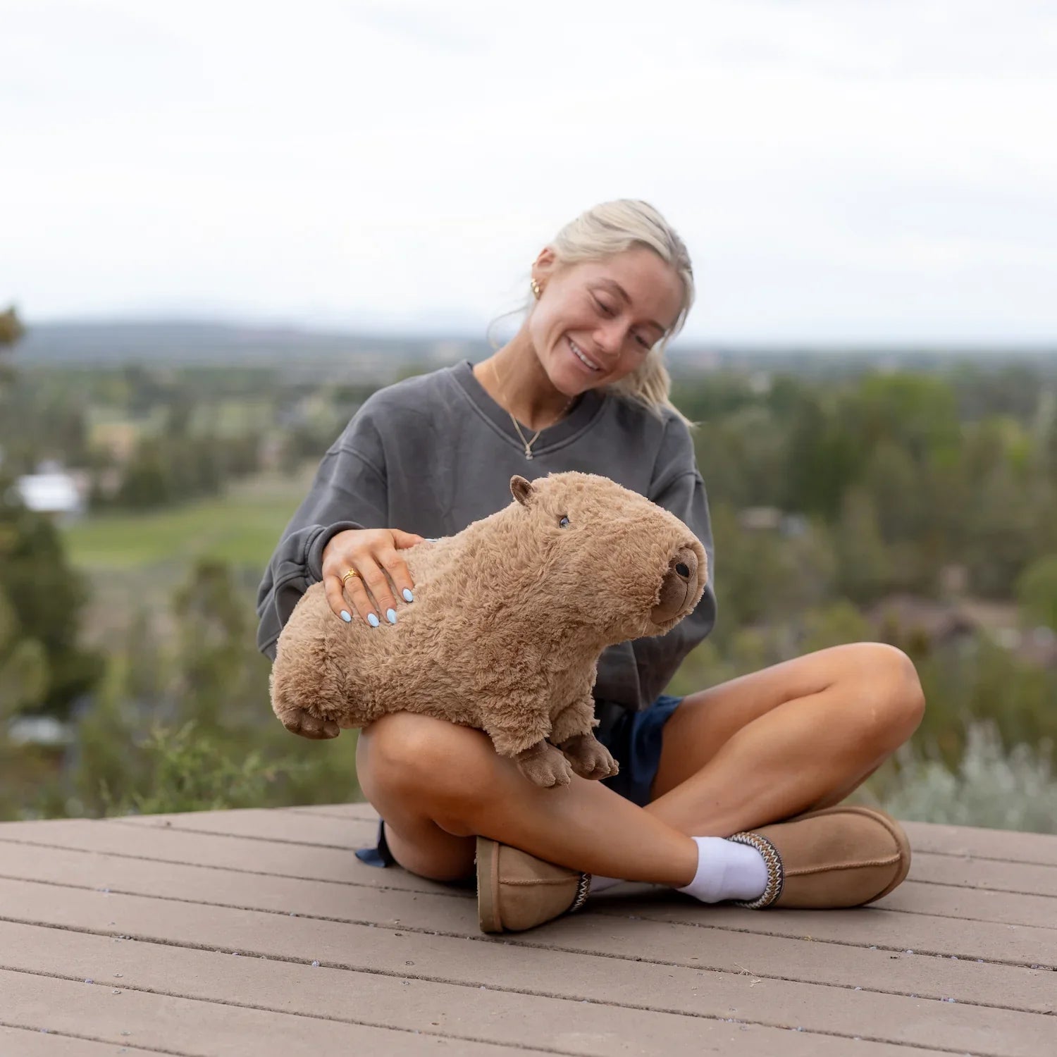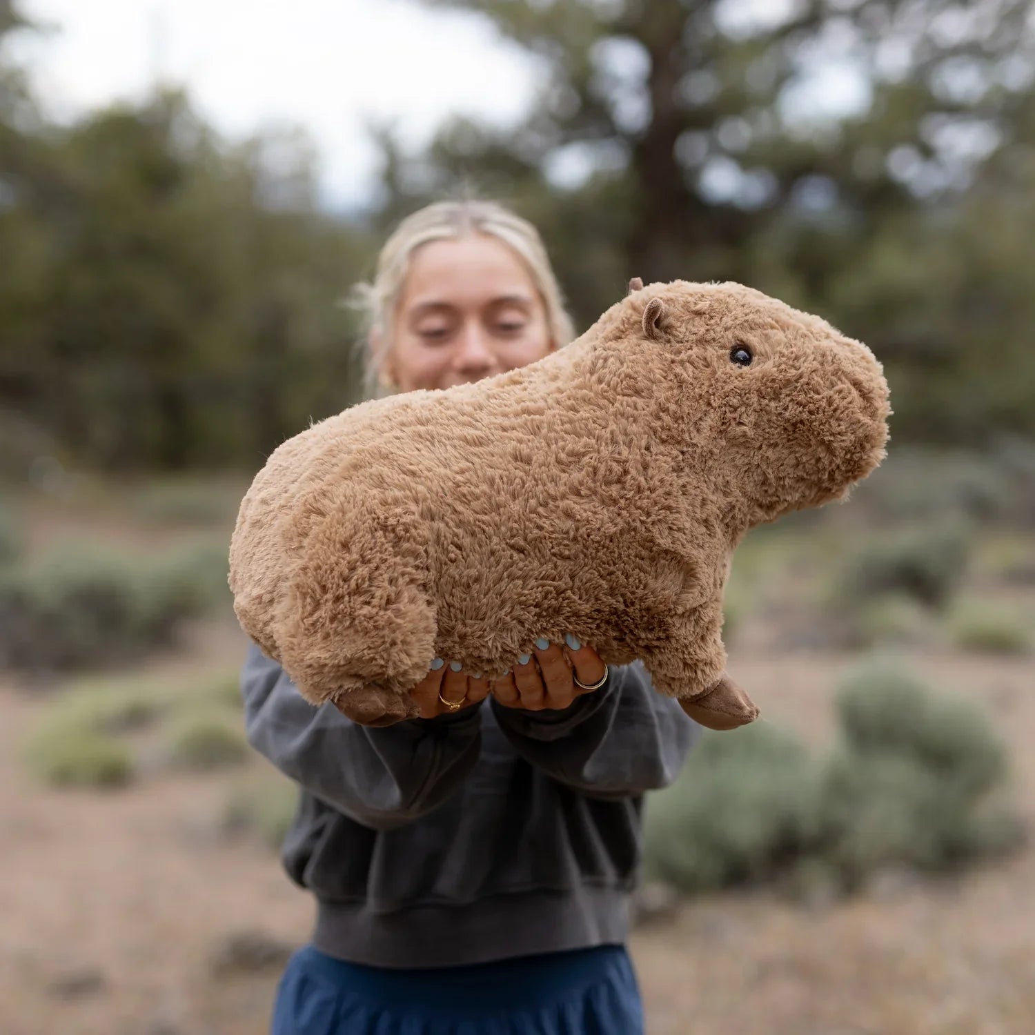 Meet Peanut the Capybara! He is a 16" long, super soft Capybara weighted stuffed animal filled with small glass beads in the belly. This makes it 4.5lbs, heatable and coolable. This is a very limited drop, so secure Peanut while you can!